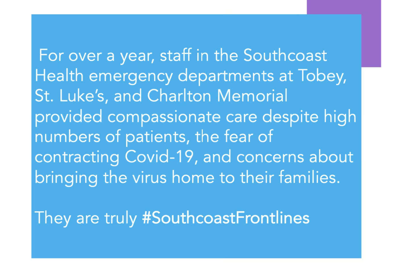 Beginning in early 2020, the Southcoast Health Emergency Departments were faced with the uncertainty and urgency of the COVID-19 pandemic. Our essential medical professionals and support staff remained vigilant, prepared, and nimble to keep our community safe in the face of grave threats to public health.