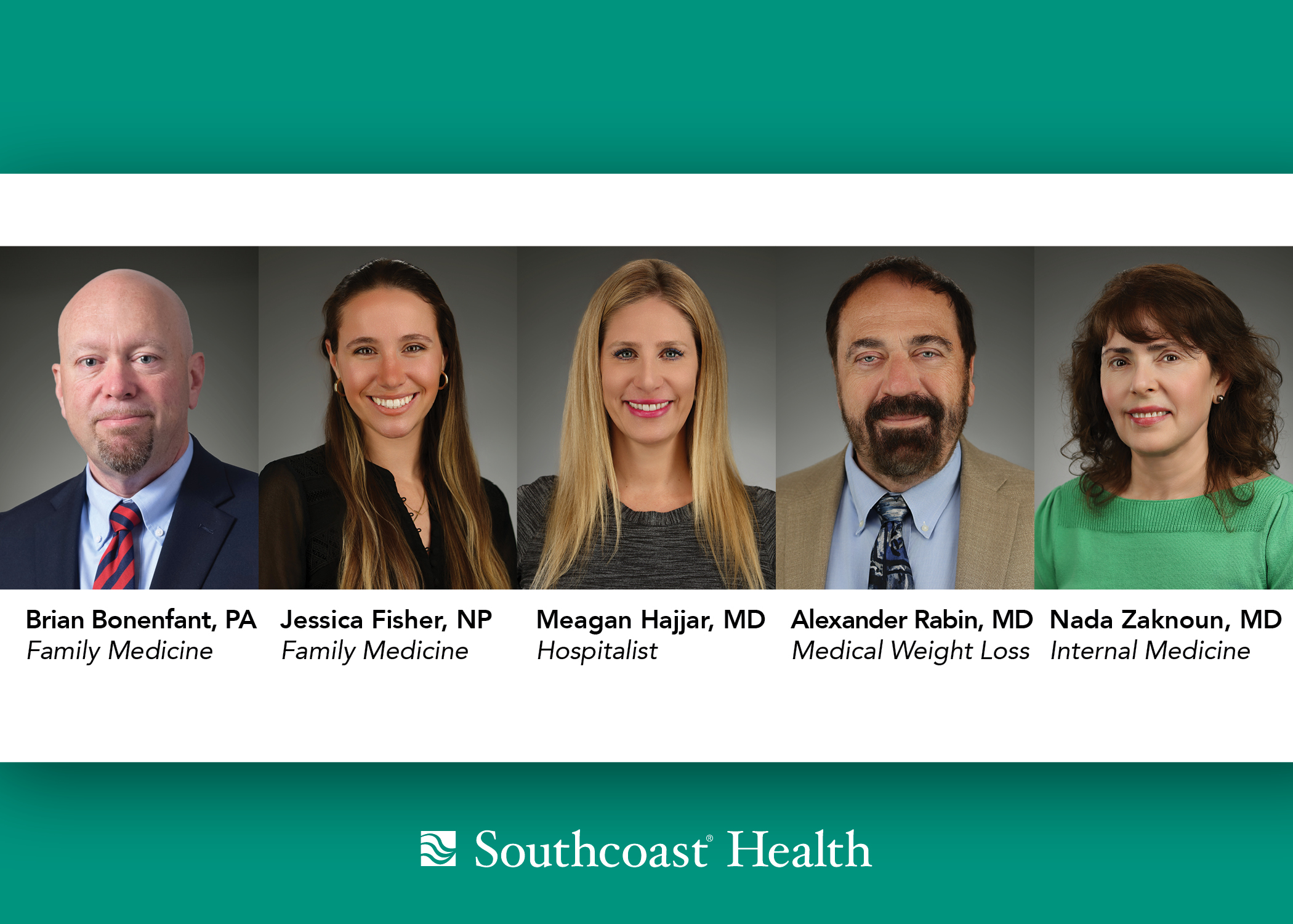 Southcoast Health is delighted to welcome Brian Bonenfant, Jessica Fisher, Dr. Meagan Hajjar, Dr. Alexander Rabin and Dr. Nada Zaknoun to our organization.