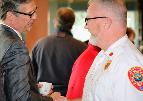 Keith Hovan, chief executive officer of Southcoast Health shakes hand with Kevin Gallagher, fire chief for the town of Acushnet, at the Southcoast Health annual EMS provider breakfast.